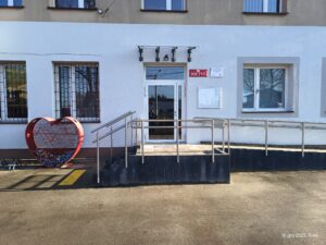 - Wykonanie pochylni dla osób niepełnosprawnych ze spocznikiem i górną płaszczyzną ruchu przy wejściu do biura, wraz z balustradą obustronną z pochwytami dostosowanymi dla osób niepełnosprawnych, montaż zadaszenia nad wejściem do budynku;